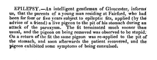 Epilepsy.—An intelligent gentleman of Gloucester, informs us, that the parents of a young man residing at Fairford, who had been for four or five years subject to epileptic fits, applied (by the advice of a friend) a live pigeon to the pit of his stomach during an attack of the paroxysm. The fit terminated much sooner than usual, and the pigeon on being removed was observed to be stupid. On a return of the fit the same pigeon was re-applied to the pit of the stomach, and soon afterwards the patient recovered, and the pigeon exhibited some symptoms of being convulsed.