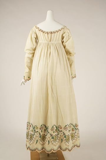 The shape of the gown appealed to me, too, because the extra fabric gathered in back reminded me of the “round gown” popular around the year 1800. And the scalloped edges on the hems of the sleeves and skirt were something I couldn’t recall seeing before.