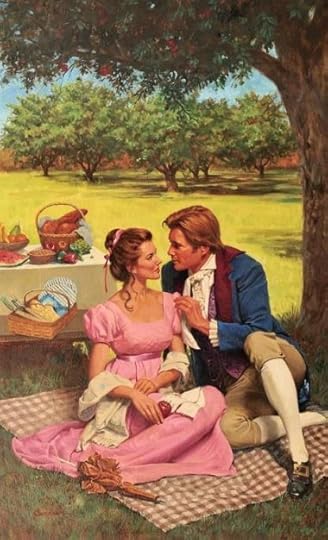 I also wonder if there’s any significance to our heroine holding an apple. Perhaps she’s tempting the hero just a little?