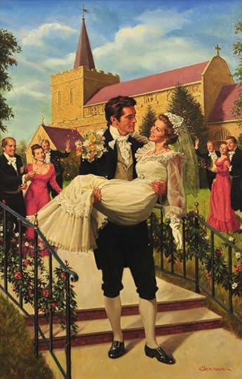And then there were his action covers that leaned a little more toward the romantic, like this one depicting a heroine being carried off by her handsome groom on her wedding day: