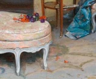 She’s been outside earlier in the day. Before her gentleman suitor arrived she picked a few wild flowers; but in her pleasure at seeing him, she forgot all about those wild flowers and discarded them at the foot of her chaise.
