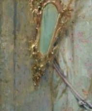 Suspended among the draperies directly over her head is a mirror, which makes me wonder if the artist is trying to tell us a little something about the young lady’s vanity.
