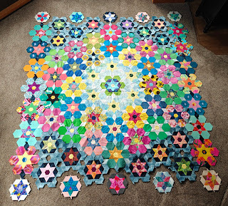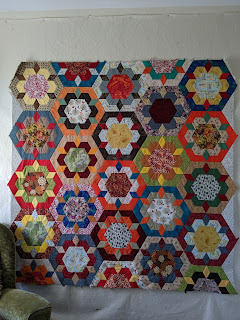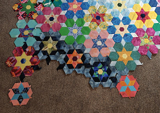 The loose hexagon blocks along the bottom and top are placeholders. Those right above and below them are the new blocks, hehehe. Blocks on the sides aren't yet stitched together. So much sewing (and basting of shapes) remains, one of these days.Because that's all writing used to be, my dream. I was a wife and mum, and I was and still am thrilled with those activities. Yet I wanted to write fiction. I had (and still possess) more plots than sense, and what I wanted to do with all those crazy ideas was craft them into some cohesive prose.