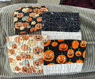 Coaster on the right is for a sprite who truly adores mug rugs. Those two fabrics were a couple of my autumnal faves!One is going to a little girl who LOVES mug rugs. The rest are for my youngest daughter's family, and all went out in the post today. Kind of a last minute-ish sort of project, seeing how Halloween decorations have been in shops for several weeks, but when I was a kid, decorating for holidays didn't happen until said holiday was right on top of you. Makes me feel a little aged noting that, lol.