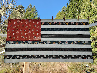 I learned A LOT in sewing the first one, which I have belatedly titled, 'Stars and Swans-Reclaiming the Flag'. I learned that 1) Flags aren't hard to make, but unless you follow a well-written tutorial, best assume your efforts will be improv. 2) My flags are art as well as defiance tools. I want them to be pretty as well as functional. And 3) Just when I thought with Kawandi-inspired quilting that I was ready to give up my sewing machine, I was wrong.