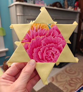 But what about that bright pink sun? That scrap of Kaffe Fassett material had been slated to go into the block below. Yet when I tried fitting it in, its massive PINKNESS overwhelmed the rest of the hexagons, so to the office I went, cutting another piece for the block. The new hexagon is the top right, with what looks like plentiful veins attempting a coup. Veins reside above my hand, where I'm trying to keep the entire block from tipping over backwards, and while veins aren't what I was hoping to feature in this block, better than one exuberant pink sun outshining all these lovely slips of fabric.