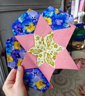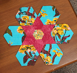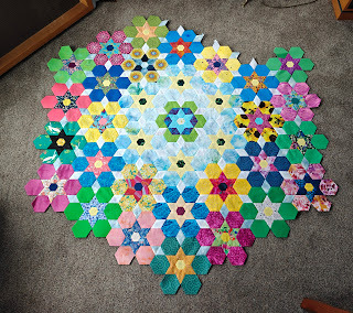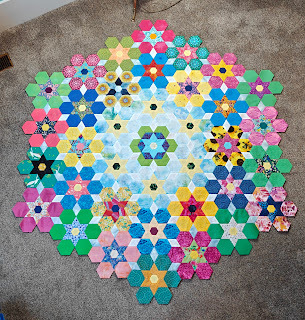 I thought a shot of this had already been posted, but I can't locate it, so here it is. Kind of a circle, definitely a lot of fun.But before I wax about the coming year, I've finished the pink/green round of Alexandria, and have started basting/stitching the next batch of hexagon blocks. I'm also thankful that other than tucking diamonds into slots on that large circle-ish gob of fabrics I am onto the next chapter of that quilt. I've loved putting it together, but am ready for something different, smaller blocks that will invariably lead to large sections that will eventually be tacked onto that circle; this is going to be a BIG QUILT. Yet I'm not apprehensive, merely curious how it will look once completed, sometime next year.