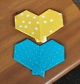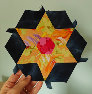 Anyway.... Since starting these hearts, I've tried to squeeze time to make more of them. There's plenty to do for Alexandria, and I am, stitching hexagon blocks like the one above. I have eleven more to make, then of course HEAPS more to configure, but these hearts, oh my goodness, they're addictive!