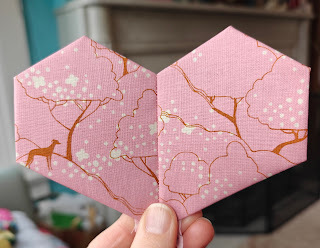 So lately while my husband eats his oatmeal, I've been sewing jewels into hearts. I finish breakfast before him, mostly because his oatmeal takes ages to prepare (he chops an apple and uses old fashioned oats, which takes a good five-plus minutes to cook). Yet I don't like leaving the table just as he's sitting down to eat. Years ago I kept English paper piecing on the dining table, as I was awake before he was, and wanted to do something productive, if I wasn't writing, before he left for work. I don't like being idle, it makes me twitchy. Better to sew something than feel twitchy any day.