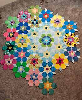The current round of pink-ish and green hexagons is halfway done, woo hoo!The second reason is.... 2) The above quilt! Or what's emerging as nightly I ecstatically stitch away on Alexandria. OMG I am SO IN LOVE with SEWING this QUILT! I'd been deeply (DEEPLY) concerned if a medallion-style pattern would drive me round the bend. On the contrary, it's driving me deeply (DEEPLY) in love with this manner of quilt (EPP-style) making. Part of it is how large (2") are the pieces; wrangling them into place, then sewing them together, is such a stop-start effort, although let me be totally honest; hand-sewing a medallion quilt is VERY stop-start, and I'm exceedingly grateful I upsized Jodi Godfrey's design.