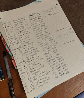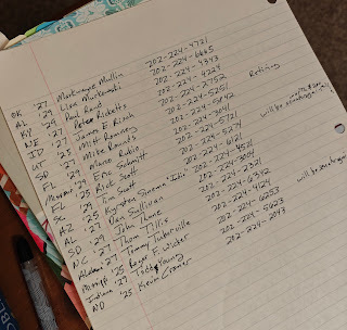 Page one of two....Certainly time consuming; doing my civic duty these days means more than half-heartedly paying attention to the barest news items. In addition to signing up for American of Conscience Checklist, I'm pondering other avenues of using my voice. Today I wrote down all the Republican U.S. senators, their office phone numbers, and the end year of their terms. You never know when you might need to call an elected representative.