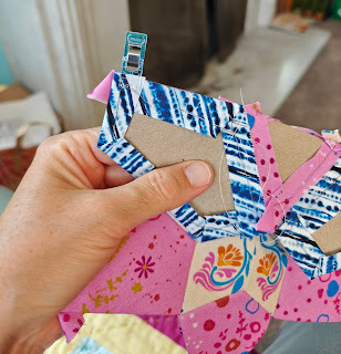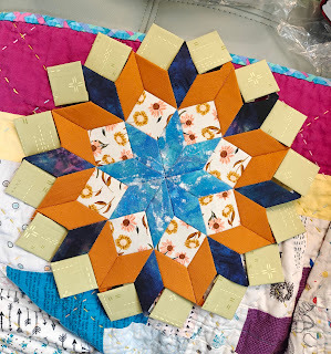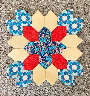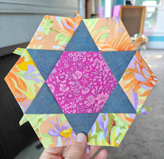 Today's photo is of a Lucy Boston block finished a couple of days ago out of my Go Bag hexie box. It's certainly scrappy, and I'm thankful to Past Me for carefully fussy cutting the outlying honeycombs, although they kind of clash with the inner papers. I have no idea what will become of the block, probably add it to the stack of other finished Lucy Boston blocks. Again, some parts of life are merely meant for RIGHT NOW. There's no big agenda other than breathing deeply, giving thanks for the ability to do so. And so life goes....