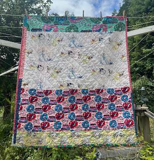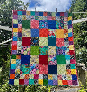 A great day to hang a quilt!Another finish, that of a fabric variety; this is the second in a brief series, lol. Our grandson is visiting for a fortnight, so time to set aside some of my usual pastimes, although there's always a spare moment for the last few stitches along the back of a binding, then tossing said quilt in the wash and voila! Mild crinkles but much goodness amid solid and print vibrancy. Ahhh, I do like myself a lovely little baby quilt.