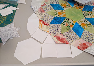 Not that I'll be bored when it's done; other paper piecing projects are waiting, in addition to a Honeycomb Stars Quilt, pattern by Rachel Hauser, that awaits my attention. I was going to work on that this morning, but first I need to baste shapes, so instead I sat back at my computer, HAHA, to write this post. I've spent the last two mornings reading over the last book of my current series, and that's been a JOY! Not only in that it's in very good shape but for the sheer pleasure of reading. Rarely do I peruse my past novels, but a few have a strong claim on my heart and this series is certainly one of them. But edits are an early-ish activity, I do like myself a routine. Hand-sewing at night, other than basting fussy shapes, sewing late morning/afternoon. The garden shrieks for my attention, and yeah, I'll get to it. But I'm an indoor girl at heart, good thing we live where theoretically the weather nudges one toward interior pastimes.