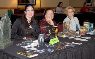 With Misty Massey and Faith Hunter at our tableThis was the first year RoundCon featured a creative track, and anything new takes a bit to catch on. During a few panels the panelists outnumbered the attendees, but as the con continued I think word got around and we ended up with a nice handful of people by the end of Saturday night. (Not surprisingly, our "The Battle of Sex" about sex in genre and writing sex and sexual tension was the most popular panel. It was also our last panel of the night and we were all a little silly by then.) The great thing about such a small group was the amount of interaction that was possible. We really got to chat with everyone and we were able to shape the discussions to what attendees wanted to talk about. I'd like to send a special shout out to Pat who attended every single panel and Debbie who started with us bright and early Saturday morning and hit almost every panel.
