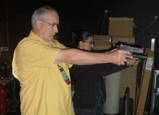 Tom Sweeney and Kalayna. FATSRemember when I said I had to sign a waiver? That was for my FATS session. That's Firearms Training Simulation. Basically, it was the coolest video game I've ever played. I've always been more of the RPG gamer than first person shooter gamer, but yeah, I would own this system. The guns were real, but outfitted for the program and the scenarios were multiple variable life or death situations a law enforcement officer might come in contact with. In fact, officers are trained with this system (which means I probably shouldn't call it the coolest video game ever, but what can I say? I'm a product of my generation.) There were two parts to the training, the first I was with a partner, and after a rocky first scenario where I completely and totally missed the bad guy and shot up an innocent tree, I became a better shot and the two of us worked well together. We didn't kill any civilians, only got killed a few times, and didn't have any bad shoots that would have lost us our badges (you know, if we had one.)
