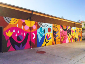 Big, bright mural at Addison and Avondale painted with neighbors under a bridge in Chicago.