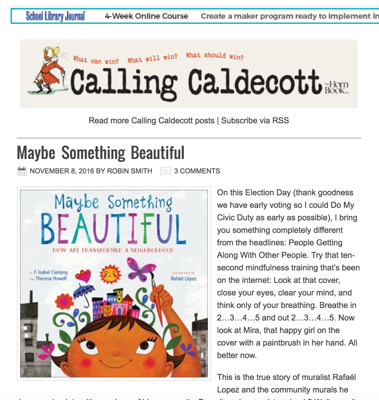 Thanks to Robin Smith for this article from the Horn Book about Maybe Something Beautiful at School Library Journal.