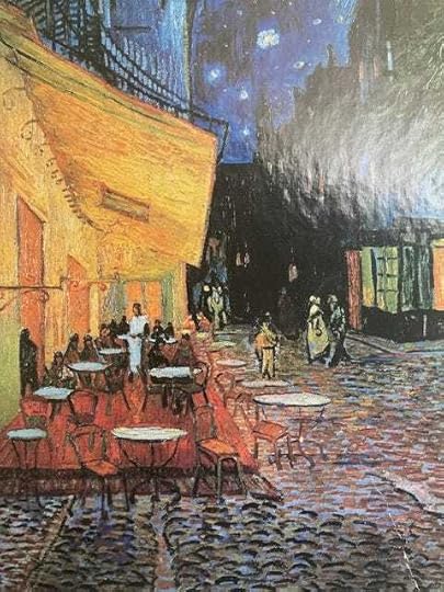 The waiter hovers at our table, the bill in hand. “Le addition, Mademoiselle.” He glances at Lars. “Aimer, ce n'est pas se regarder l'un l'autre, c'est regarder ensemble dans la même direction.” With a subtle nod in my direction, he leaves. How interesting that he’d know that quote. It came from a book published 1943, and I was inside a painting Van Gogh created in 1889. Perhaps my friendly waiter was another Timewalker, visiting Arles on a starry night.