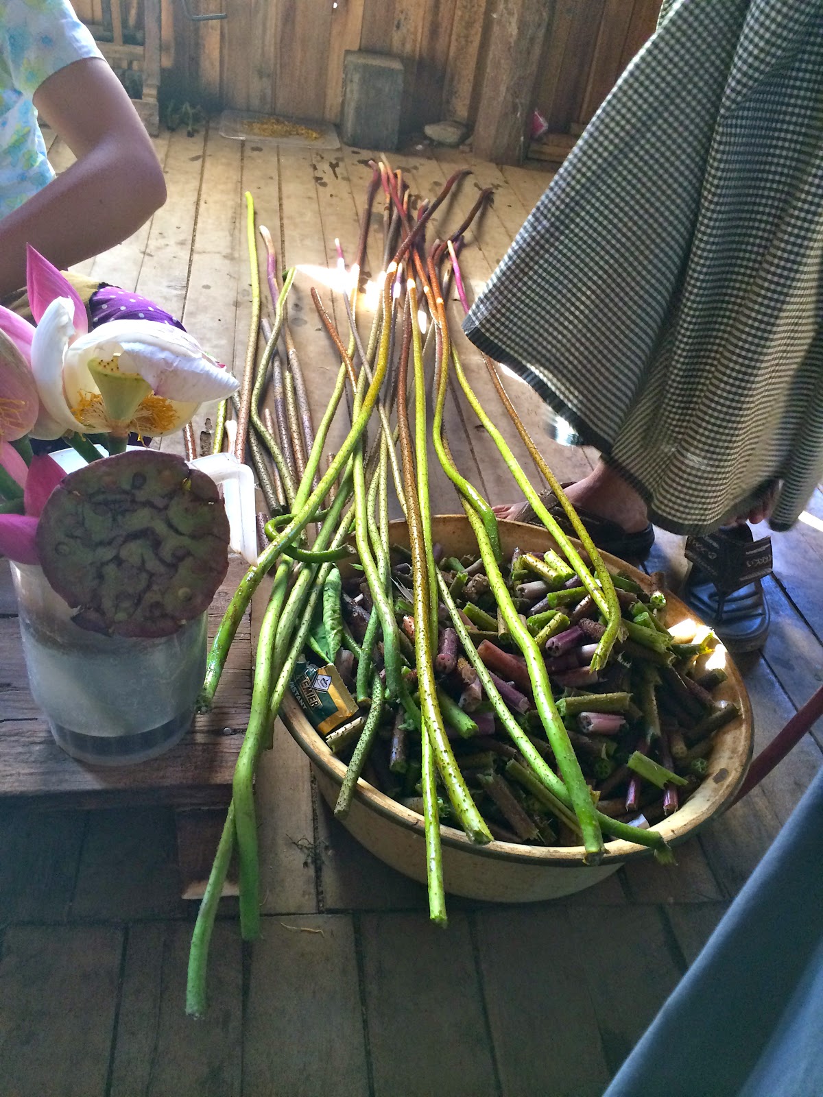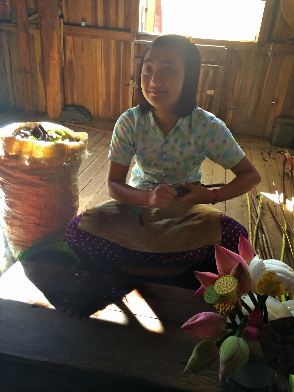 Here the girl peels and shreds lotus that will be made into a very fine scarf or skirt. A lotus scarf costs about $35 US. A cotton one about $8. Silk is $25.