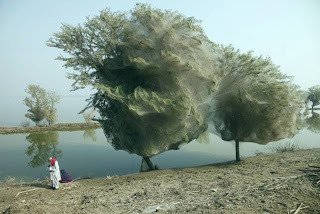 What brought this post on were these pictures of spider-webbed trees, an unexpected side-effect of the flooding in parts of Pakistan earlier this year. It seems millions of spiders escaped the rising waters and stayed among the branches, creating these surreal images. When I saw them I wondered how I'd put something like this into words. My first try was to call these trees captured by smoke. How would you describe what you see if you were writing a description of these trees?