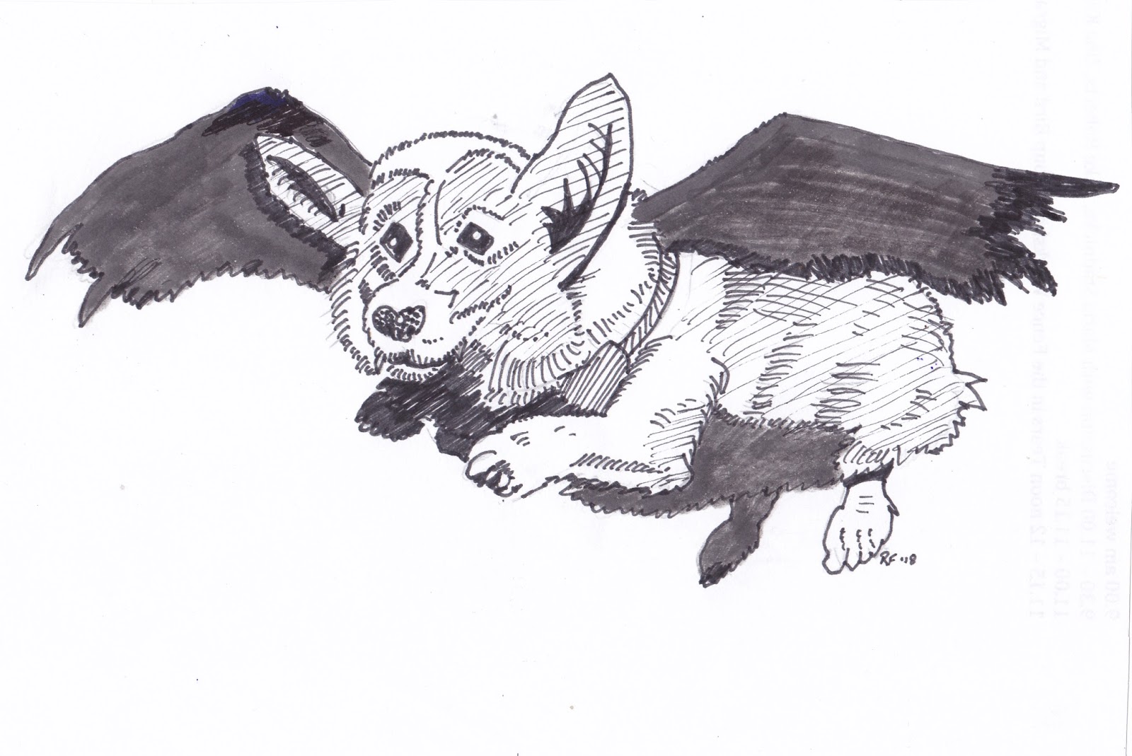 With my partner at this time, I go to an animal rescue centre and we return home having taken possession of a flying dog. It has ginger fur and in some ways resembles a corgi, but it is also bat-like. It has very large, furry ginger wings that make a ‘swish’ sound when it flies. Take-offs and landings can sometimes be a bit dodgy, but up in the air it moves with grace and elegance.