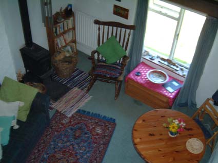 The living room: our cwtch. A section of white-painted stone wall protrudes into the room, to the left of a wood burning stove and small well-packed bookcase . Draped from its top surface ledge, held in place by an unused spinning wheel, a ‘witch’ doll and three hand made teapots, is a roughly sewn patchwork quilt. The exposed surface is made of flowery and patterned cottons – from old dresses, perhaps – in simple squares. From one of the beams on the lean-to sloped ceiling, a wicker basket hangs. Below this a small round pine table, with three matching chairs, and a rocking chair. Against the opposite wall an old sofa, scattered with random cushions, and an electric heater in the corner. Red velvet curtains hang on either side of a small window, which looks out on a garden view, ageing wooden bench seat prominent on the grass. On the sill, a collection of beautiful objects – boxes, hand-painted stones, a vase of fresh picked wild flowers. On a small chest of drawers, there’s a TV for those who want it, discretely covered with a drape of diamond patterned Indian-design material. Next to it, another vase filled at this time with the season’s daffodils. On the walls are various pictures, original paintings by the proprietor amongst them, and a mirrored candleholder. And hanging, nearby, a deep and richly sonorous set of wind chimes. A lushly patterned rug sits on the carpeted floor. Overlooked by a ‘sleeping platform’, reached by means of a steep wooden staircase that descends into the room, this is a profoundly restful place. It is suffused with a sense of calm and grace. At the foot of the Presellis and a few minutes walk from the Gors Fawr stone circle, it’s amongst the most beautiful holiday accommodation I’ve ever experienced.