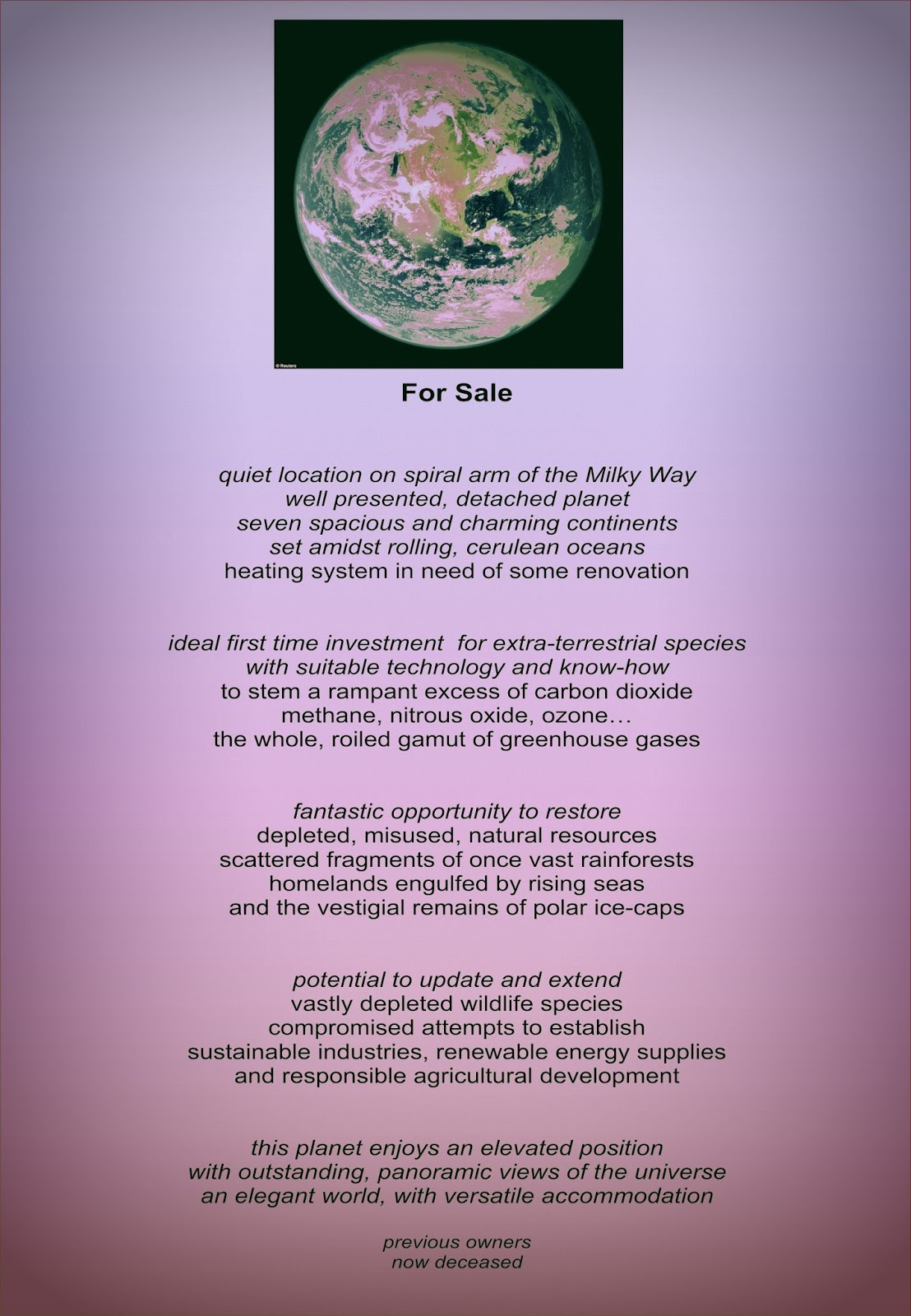 Originally published in 'And This Global Warming' anthology,Roynetree Press, 2012(& proud I am that it was)