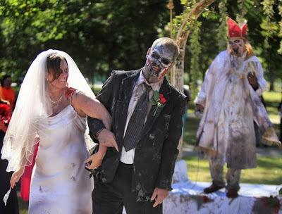 The bride wore a white dress. The ring bearer and flower girl were adorable children who walked down the aisle playing their part. The groom smiled brightly as his bride walked toward him. But all, including the officiant Brian Blair, were covered in gray skin with darkened eyes, fake blood dripping down their face, hair disheveled and clothes worn with holes and rips. They looked like the walking dead. And they were happy about that. Read more:
