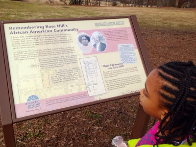 An hour later, we were in the midst of one of our frequent our neighborhood walks and we stopped by this marker, which we'd seen before. But today, after reading about the historic Rose Hill African American community, we took the time to have an important discussion about the effects segregation and racism on neighborhoods.