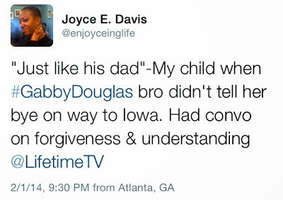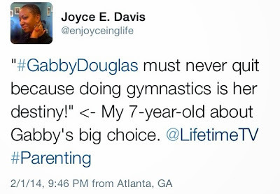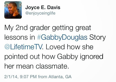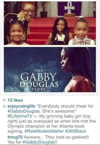 We ended the evening watching a recent edition to the annals of Black history through "The Gabby Douglas Story" on Lifetime. Douglas is the first American gymnast to ever win gold medals for both the individual all around and the team competitions during the same Olympic Games. I was thoroughly impressed by the age appropriateness of the TV movie and even more by the observant comments made by my smart girl. Posted a few: