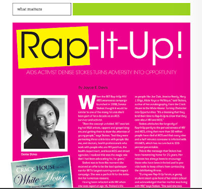 But there were others who had been on the front lines of the awareness campaign about HIV/AIDS since 1998. One of the most committed was Denise Stokes, the lead spokesperson for Rap-It-Up who'd been infected with HIV at age 13. When I interviewed Stokes for the 2012 BET Awards Viewers Guide (page 34), her passion for raising awareness about HIV/AIDS was moving:
