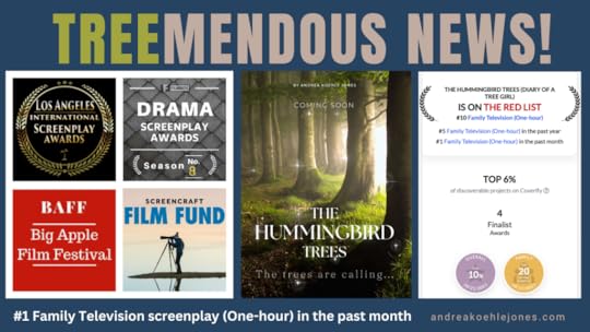 The groundbreaking tv screenplay by Canadian screenwriter Andrea Koehle Jones — The Hummingbird Trees (Diary of a Tree Girl) — advanced again. 4 accolades. The Red List. #1 Family Television (One-hour) in the past month. Thank you Coverfly!