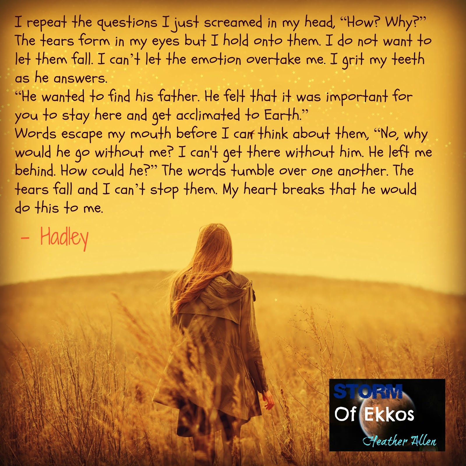 Hadley Morrow had a purpose, go to the other Earth, kill the intruder and return to Ekkos. She was to complete her task without anyone on the planet seeing her. It was a test, her first opportunity to prove herself. But he almost died because of her and she had to act. It was stupid but it happened. Now she finds herself stuck on the wrong planet with a boy she resents, but can’t leave behind.