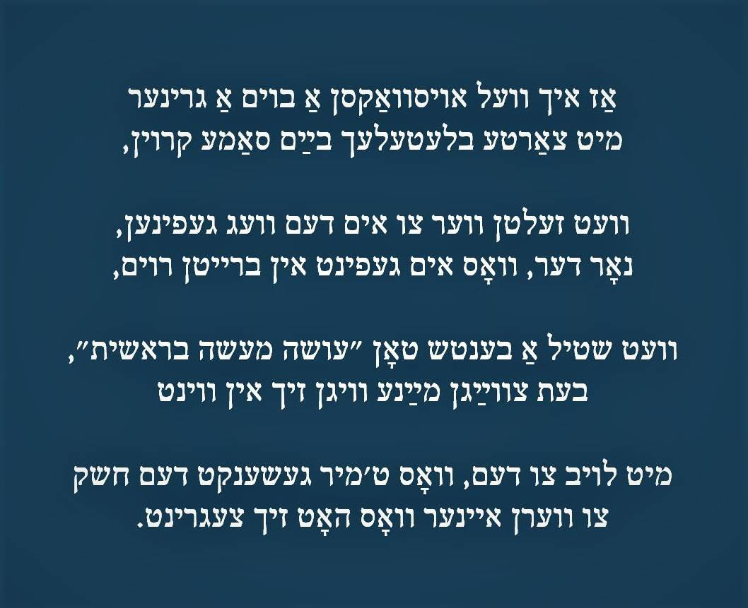 checkmark caution-solid קלאָר: די וועלט כ'וועל ניט דערגאַנצןסײַדן, אפשר, דאָך?.. — כ'וועל איר ניגונדל דערטאַנצןאויף דער פולער וואָך...
