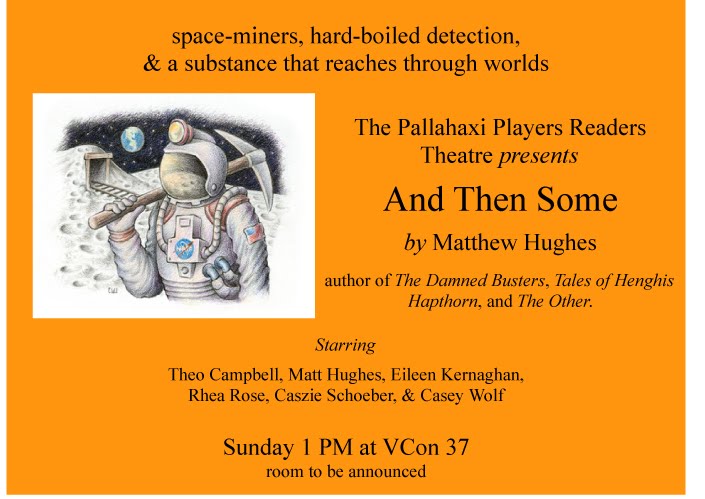 Not to be forgotten, the last weekend of this month is VCon 37 , which I'll be attending with my nephew Theo Campbell. The Pallahaxi Players Readers Theatre is putting on our second show, "And Then Some" by Matthew Hughes. Matt's work appears regularly in Fantasy & Science Fiction, and he is the author of The Damned Busters, Tales of Henghis Hapthorn, and The Other.