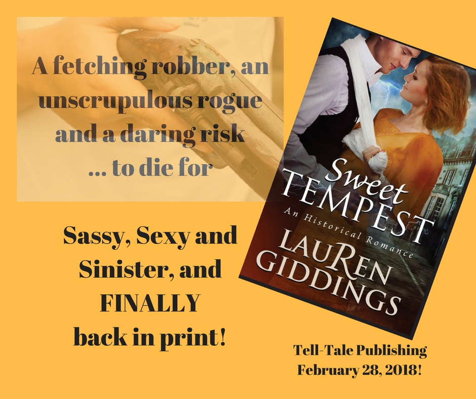 When my first published book, SWEET TEMPEST, written under the pseudonym Lauren Giddings, became unavailable after going into a second printing with Kensington Books back in the '80s, I never thought it would get back into readers' hands again. Thanks to Tell-Tale Publishing, my historical debut will return to print and e-book on February 28!