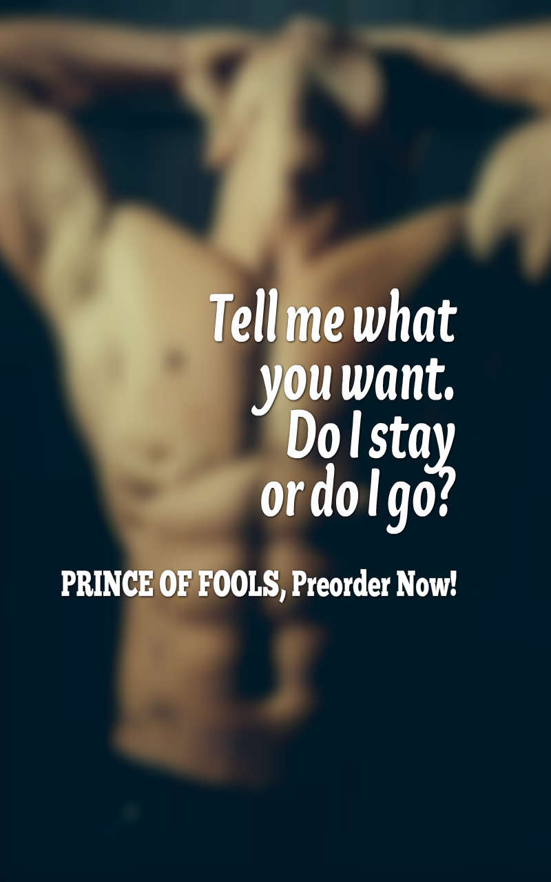 As promised, here’s the last part of the scene between Amber and Rico in PRINCE OF FOOLS . She needs to keep him at arm’s length for both their safety, forcing him to sacrifice everything he desires . . . if she says the word. But can she? His last petition to her was, “Just don’t push me away.”