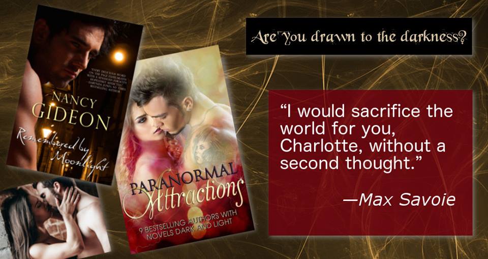 Writing is on a temporary hiatus as I scramble to get things ready for the June 20, 2016 release of the first boxed set I’ve ever participated in along with eight other uber talented authors (What a learning curve!). My addition to PARANORMAL ATTRACTIONS is REMEMBERED BY MOONLIGHT from my By Moonlight series. PARANORMAL ATTRACTIONS is now available for pre-order through Amazon. Check out this lush cover! More to come on this next week . . .