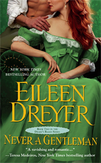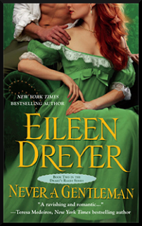 Never a Gentleman is one of those rare books the time-impaired reader delights in. It grabs you from the first sentence: The room stank of whiskey, sweat, and despair. All right! I am so down with this book already! I fell in love with the hero, the elegant, supposed wastrel Diccan Hilliard in that initial scene. But wait…it gets better. Then I met the heroine. Miss Grace Fairchild isn't your typical delicate Regency flower of femininity. She isn't your typical anything. She's unique: a campaigning soldier's daughter, tall, plain, and outspoken, who instead of falling into vapors when accosted by highwaymen, calmly puts a bullet between one of the villain's eyes. I confess, I'm only halfway through the book, but I'm totally caught up in the marriage of convenience between these two honorable and awkwardly in love and lust characters. Then, throw in the intrigues of the time and two wonderfully drawn sets of relatives…and I can't wait to get back between the covers again. No one tells a story like Eileen Dreyer. And after finishing this one, I'm going to find Barely a Lady and let her tell me another one.