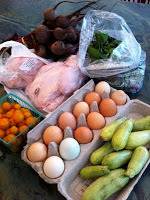 I have a confession to make: I'm addicted to farmer's markets. It's true! If I could go every day (and if we could possibly eat enough produce to keep any from going to waste) I'd be thrilled. As it is, I make it about once a week. Lately I've been buying fresh eggs, local peaches, swiss chard with pretty rainbow stems, tiny little shallots, and the sweetest, juiciest tomatoes imaginable.Peaches are Mr. Louisa's favorite fruit, next to strawberries. I'd probably have to go with raspberries, myself, but peaches are right up there. As for vegetables, it changes with the seasons. In summer? I can't get enough tomatoes. It's like my body is craving them! (And yeah, I know they're technically a fruit. But come on, do you really think of them that way when you slice them up with fresh mozzarella and basil and drizzle them with balsamic vinaigrette?)