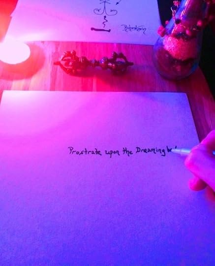 Inscribing the chant and seal of the Mara by candlelight with bottled ash and Tibetan dorje (thunderbolt). These hand-fashioned sheets will be included in the Auric Edition of The Benighted Path.