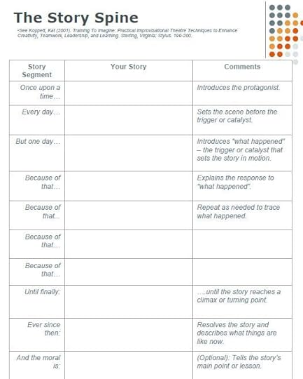 A friend sent me this story spine graphic. First designed by Kenn Adams, it’s a simple, yet effective, way to keep you on the path through the woods (the story). Hope it helps.