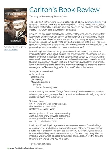 I was excited to read this review in the Florida State Poets Association magazine: OPAP (Of Poets & Poetry). Thank you to Carlton Johnson for a lovely review of THE WAY TO THE RIVER (Kelsay Books). I’ve included a jpg of it below. Enjoy! And if you get a copy from the publisher, let me know what you think! (Soon available online at amazon.)