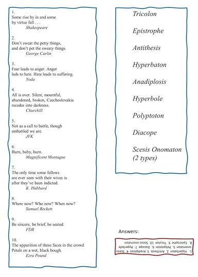 Ready to take a quick rhetorical elements quiz? How well do you know these fun writing tools? Before you take this quiz it’s wise to read up on these literary tools. For a couple of playful articles on rhetorical elements check out these two posts by yours truly at the Florida Writers Association blog: