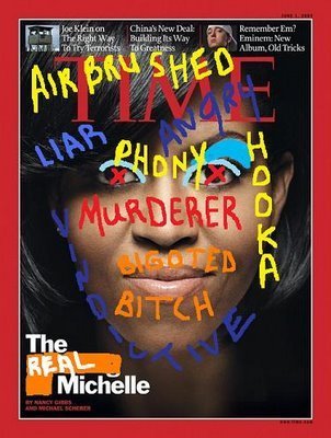 Has anyone seen the new cover of Time Magazine? How about the photos of Michelle Obama in the article itself? This RACIST, LYING bitch has been airbrushed by every magazine in this country to look every way except for what she really looks like. If you are going to put this poster bitch for racism on the cover then why not put the true photo? Why is it that this never at home with her kids when in Chicago (Momma Mirian Robinson was the