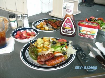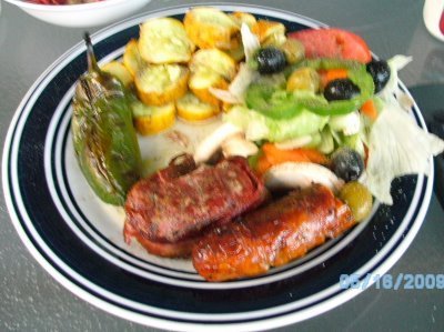 Maxine and I have started a tradition of every Saturday grilling dinner and watching a movie. This week it was bacon wrapped Fillet Mignon and Italian Sausage for Maxine and grilled yellow squash, baked potato and salad of bell peppers, green & black olives, scallions, tomato, mushrooms & lettuce with raspberry walnut vinaigrette dressing and roasted Jalapenos for me. For dessert we enjoyed fresh strawberries, kiwi and banana's.