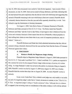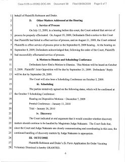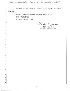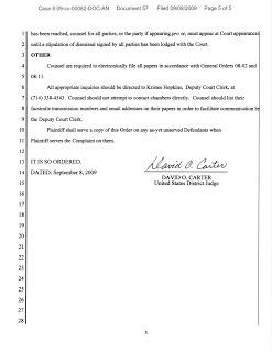 One item I think needs to be noted is that contrary to claims that the Judge denied Defendants Motion to Dismiss, according to the below Order's, Judge Carter set the Defendants Motion to Dismiss to be heard on October 5, 2009. Again, this is for informational purposes only and to be truthful and accurate about the rulings Tuesday.