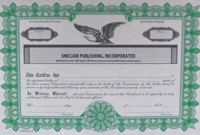 Sinclair Publishing, Incorporated received Three (3) Double Eagle Gold $20 coins to be used to raise capital today. In addition to the coins arriving (which by the way was an incredible gesture of faith by the individual who offered them to help this cause), our Stock Certificates arrived today along with our Corporate seal.