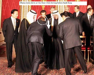 While the White House (not that Robert Gibbs, Bill Burton or David Axelrod really know anything) says Barack Obama did not bow to the Saudi King. Well look at the picture above, Obama is bent over, looking down, not looking at the Saudi King, so the White House can do what they always do (which is tell everyone they are seeing things)but the old phrase, "a picture is worth a 1000 words" and this picture demonstrates clearly Barack Obama did indeed BOW before the Saudi King.